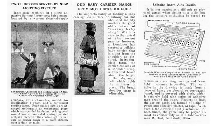 A ceiling lamp that lets you yank a fixture downwards to be reading lamp (legit good idea: I’d buy something like that from Ikea today); an “odd baby carriage” that seems indescribably unsafe; and a device for playing solitaire upright in bed, which is actually kind of cool.